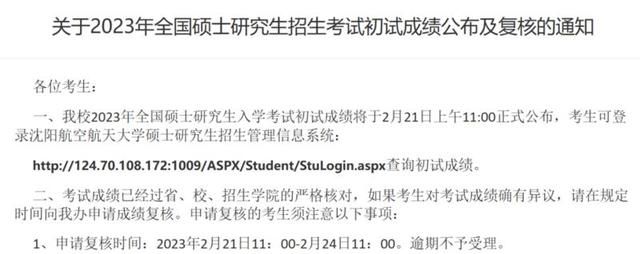 沈阳航空航天大学2023年全国硕士研究生入学考试初试成绩将于2月21日上午11:00正式公布,考生可登录沈阳航空航天大学硕士研究生招生管理信息系统查询初试成绩。成绩申请复核时间为2023年2月21日11:00-2月24日11:00。逾期不予受理。