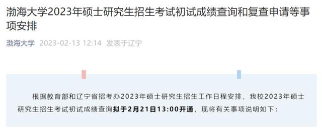 根据教育部和辽宁省招考办2023年硕士研究生招生工作日程安排,渤海大学2023年硕士研究生招生考试初试成绩查询拟于2月21日13:00开通。成绩复查受理时间为2月21日-2月23日17:00,逾期不再受理。